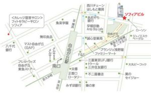 自由が丘駅の南口をでて、すぐ右手に曲がります。新しく出来た線路沿いのショッピング街自由が丘「Trainchiトレインチ」の中を通り、 突き抜けていった正面に見えます、1階にハーブショップGREEN FLASK(グリーンフラスコ)のある建物です。