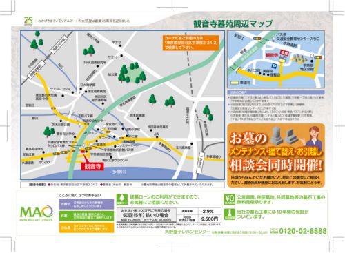 左から萩原(はぎわら)右が滑川(なめかわ)と申します。萩原はもともと仏壇販売をしており、経験が豊富です。仏具関係のご質問などがございましたらどんなことでもご相談ください。滑川はセミナーの講師をした経験を活かしてお客さまと一緒になってお墓探しをサポートしていきます。若輩者ですが、精一杯皆様のお役に立てるように努力していきたいとおもいます。どうぞ、よろしくお願いします。薬龍山修繕院観音寺さま周辺のご案内です。