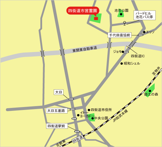 東関東自動車道、四街道インターより車で5分。交通至便でありながら静寂な環境に包まれた、近代的公園霊園です。